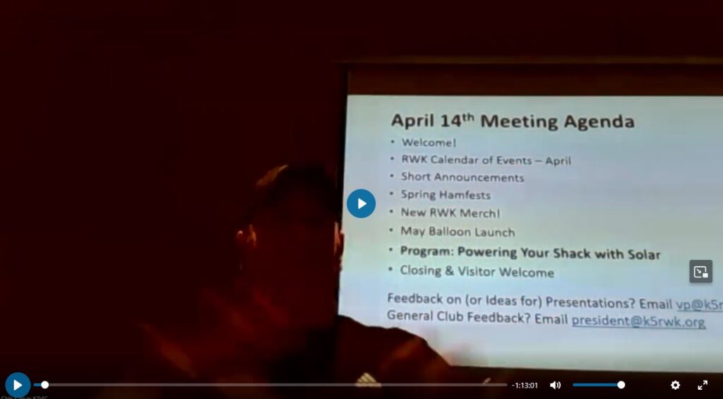 After that, I will be giving a short “work-in-progress” on a project to run my shack radios totally off of solar/battery power. Until I get a decent hail storm and can replace my roof, whole-house solar is out for me, so this is the best that I have come up with. It might be something that you want to consider as well.