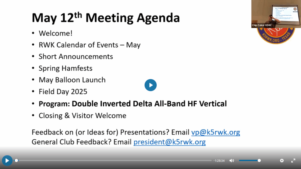 It’s antenna month (the few weeks a year that we all have to check and put up HF antennas, before the sweltering heat of the Texas summer sets in), so we thought we would show you an alternative to the traditional backyard dipole and end-fed half wave antennas. Something that might be suitable for people with small backyards or that might be concerned about nosy HOA police. Our old friend John Portune W6NBC has an inverted delta loop that fits the bill. To hear him tell it: “A small footprint wire vertical that will compete with a small beam on a tower, but it far less visible to the neighbors. It has low angle radiation, BUT is horizontally polarized for lower noise than other verticals. And also unlike other verticals, it has horizontal gain.” How does it work and how do you build it? Well I guess you’ll just have to show up to find out!
