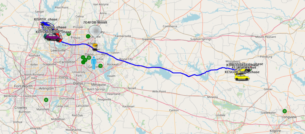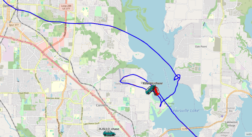 We first thought that the lower-most payload (the FT-8 transceiver) had separated as it was literally dragged across Lake Lewisville by the still-inflated balloon. However, after the balloon rose about 1000 feet, the FT-8 payload was spotted and was still attached. Nearest we can figure, since it was raining or very moist during launch, the balloon accumulated ice on the way up and that added weight brought the balloon back down. The ice melted at the surface and then the balloon started up again! From there, it was a relatively normal – if long – trajectory towards East Texas (somewhere between Longview and Shreveport). The launch team had resigned to a very short flight, but now we had a delayed hours-long chase ahead.